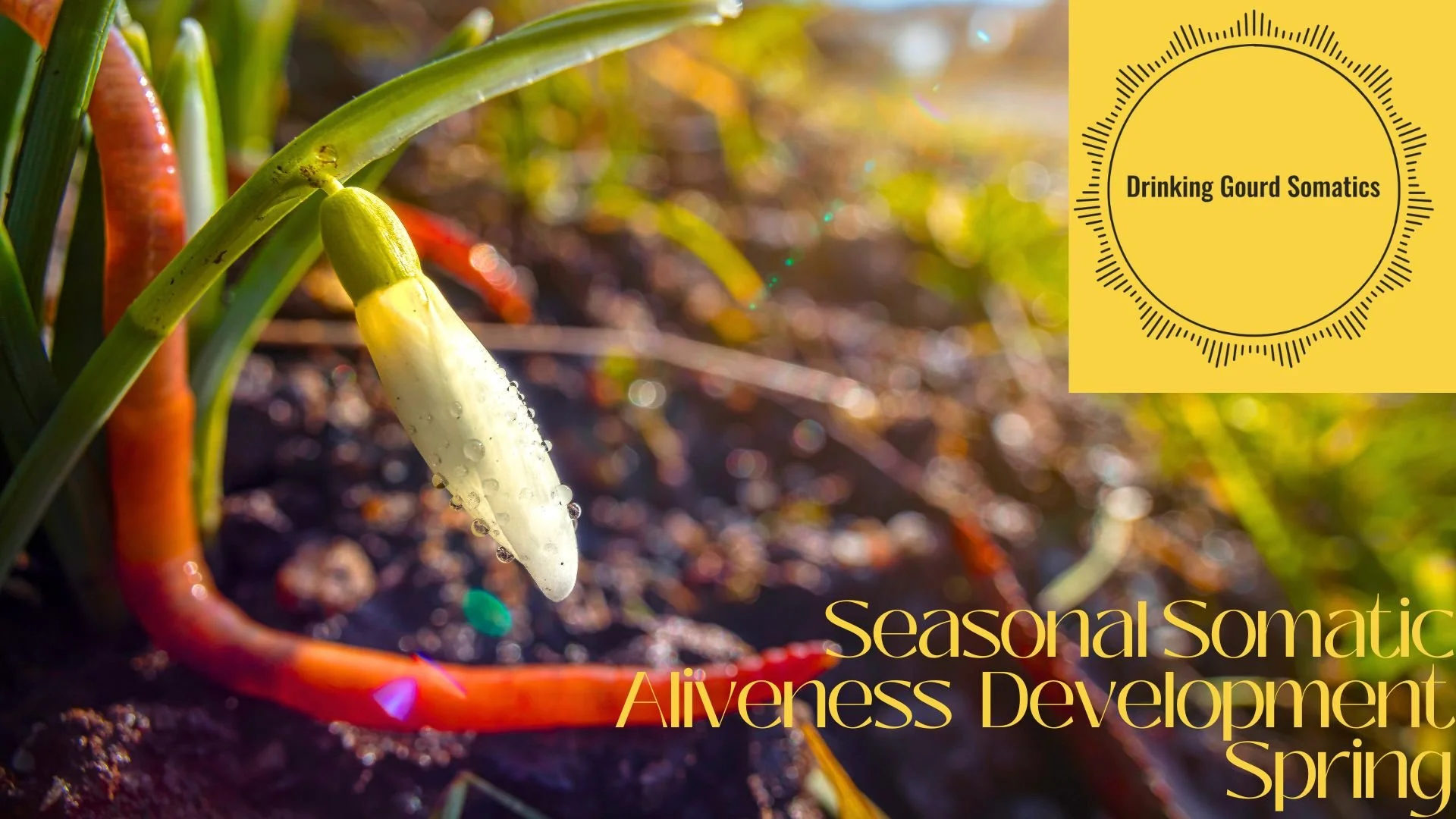 Image Description: Blooming flowers and earthworms fill the background with text below reading Seasonal Somatic Aliveness Development